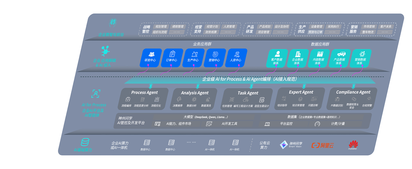 端到端的一站式AI工作空间深度融合了从企业战略规划到日常经营的全流程业务板块,,,,定向解决车企内部领域多、、部门多、、、、链条长、、场景碎片化等难题,,,支持车企快速构建以AI为核心的生产力写作体系,,实现任务执行与AI能力的无缝集成与交互