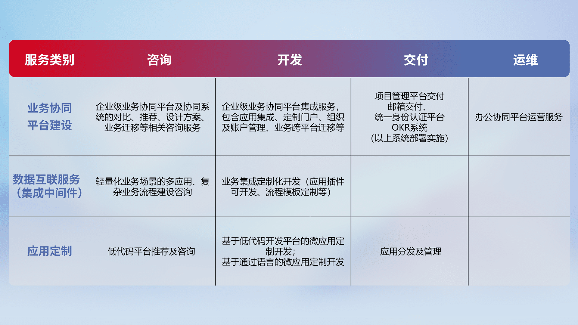 针对钉钉、、、、企微、、、IDaas等平台级产品提供产品的规划、、方案、、交付、、、定制化开发等服务,,,实现如统一协同办公、、、、智能客户服务、、、、混合会议管理、、、、智能数据查询、、等业务场景,,实现数字化转型。。