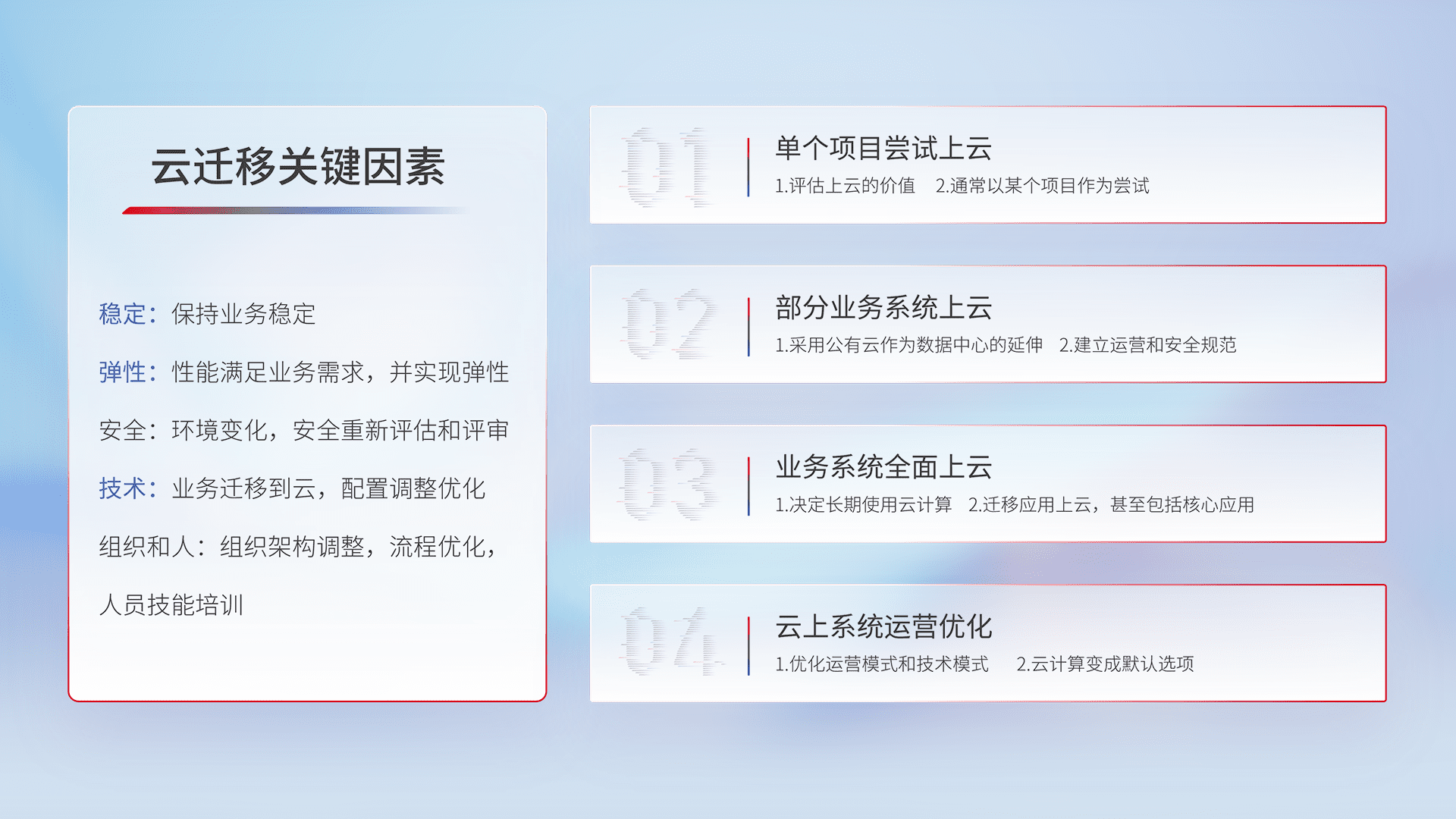 结合实际业务,,,,从规划设计、、云平台选型、、云原生改造、、、数据迁移、、集成交付,,迁移全过程为客户识别最佳上云路径,,做好风险识别管理,,,设计网络架构、、、、身份权限、、、、安全审计合规、、操作审计、、、、日志审计、、监控告警策略、、、、多站点容灾设计等,,,,对云上基础设施进行整体规划,,,,提升IT治理水平,,,以满足弹性、、、高可用、、、高性能的需求。。。。