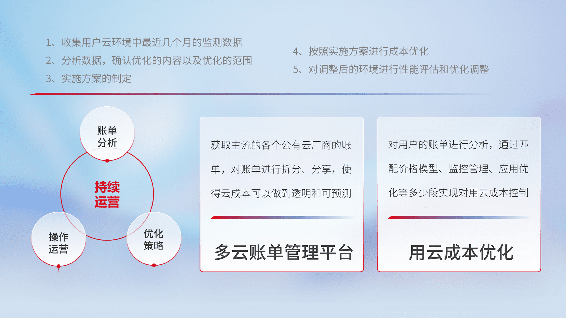 通过灵活运用多种自动化迁移工具,,帮助企业用户实现业务和数据高效 、、、、稳定的上云迁移和云上迁移,,,,采用自研多云纳管平台,,,,以中立管理模式,,,,解决多组织、、多云、、、多运维厂商的复杂关系的管理,,,保证多云平台资源配置的一致性,,,实时掌控云资源运行数据,,,,运用智能化工具分析云资源多云平台的管理服务,,,透明化管理成本支出,,,,用云成本可预测、、、用云费用可优化、、云资源配额有据可依。。。。