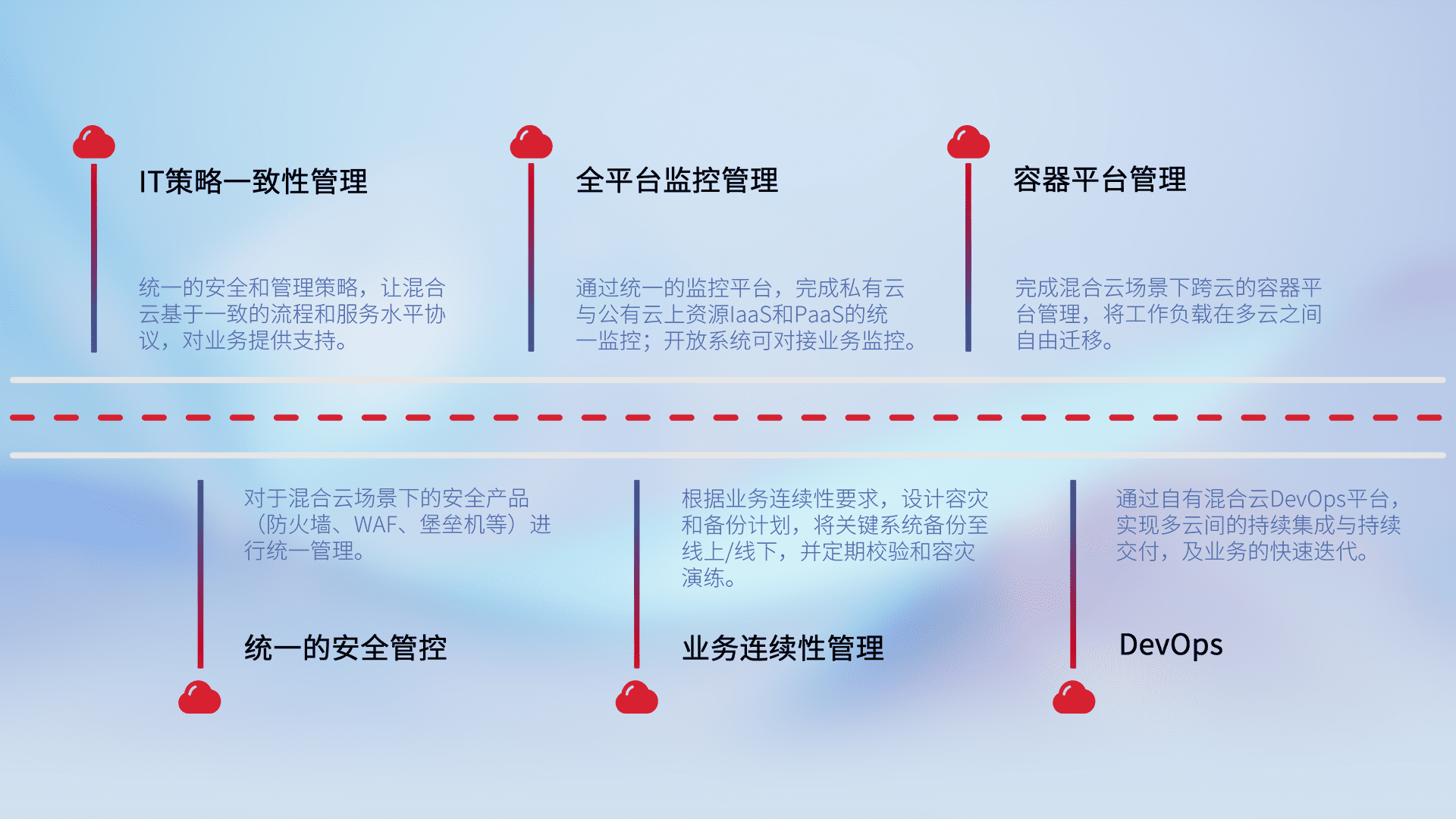 通过多云纳管,,以统一的资源数据模型把客户的云资源进行抽象和封装,,进而实现对多云资源的统一操作,,保障云资源管理的可靠性、、、稳定性与可用性。。量身定制化运维内容,,,配置、、、、开发运维、、、补丁管理、、、备份、、、监控、、、、认证和访问管理、、、、审计和日常巡检等,,保障在用云过程中的可靠度,,,稳定度以及高可用率。。