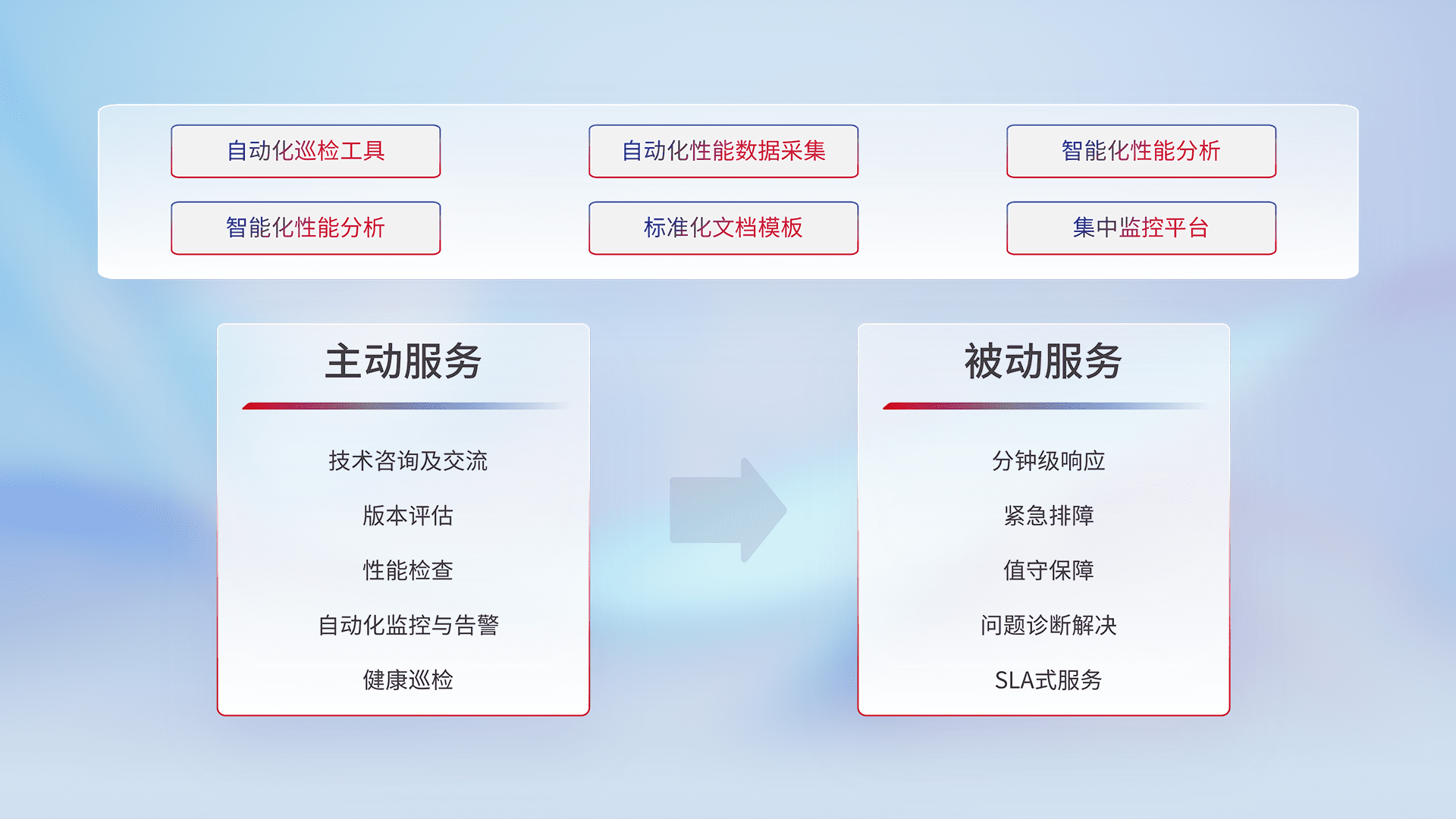 智能化工具和标准化文档,,保障服务质量,,,,提供主动服务(包含技术咨询、、、版本评估、、、、性能检查、、自动化监控与告警、、、健康巡检)和被动服务包含(分钟级响应、、紧急排障、、、、值守保障、、、、问题诊断解决、、、、SLA服务)。。
