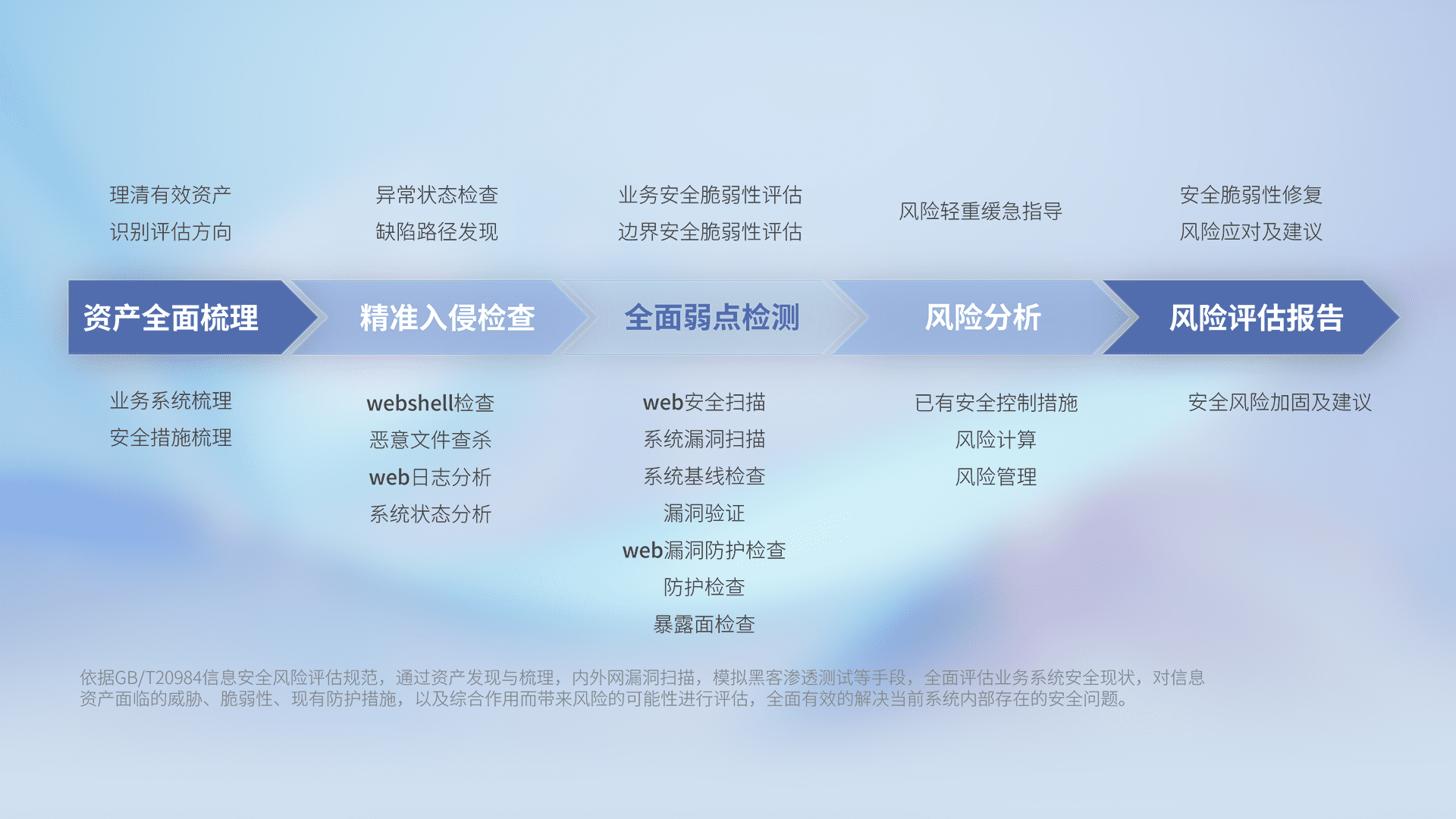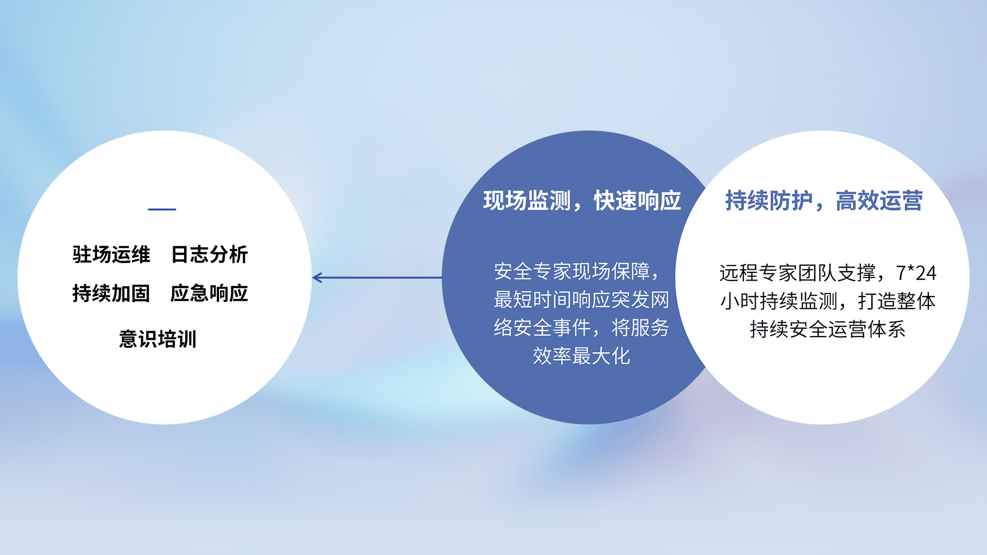 针对客户行业特性,,,以专业的安全服务+多厂商联合解决方案提供专属的一站式安全管理服务,,帮助客户全面感知网络空间威胁,,基于识别、、、、检测、、、分析、、、防护、、、监测、、响应的服务理论模型,,,从方案咨询、、集成交付、、评估验证、、、、优化加固、、、、运维运营,,,致力于为客户提供完整的闭环管理式安全服务。。以实战经验为客户打造高抵御风险的安全体系,,,帮助客户发现威胁、、、对抗威胁、、、、处置威胁,,不断积累安全对抗能力,,,持续保障数字化安全。。